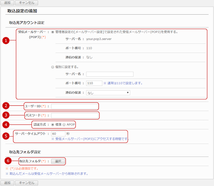 メール取込設定一覧画面の[取込設定の追加]ボタンを押すと、取込設定の追加画面が表示されます。