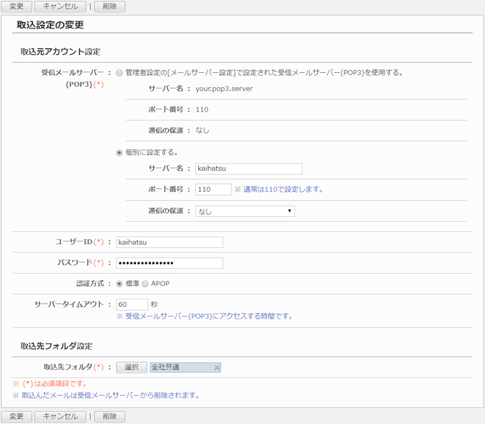 メール取込設定一覧画面の取込元ユーザーIDリンクを押すと、取込設定の変更画面が表示されます。