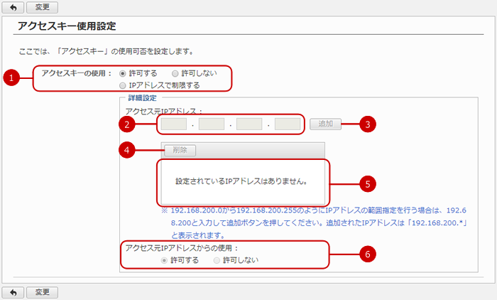 許可する・・・追加したIPアドレスとアクセス元のIPアドレスが一致する場合に、アクセスキーの使用を許可します。