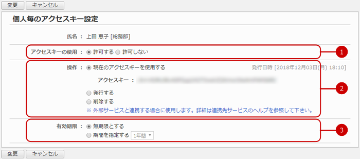 設定メニューの外部サービス連携設定>個人毎のアクセスキー使用設定のリンクを押すと、