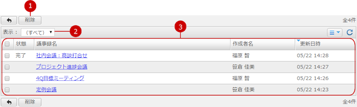 議事録の機能管理では、議事録機能で作成されたすべてのデータを閲覧、削除できます。