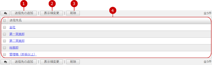 設定メニューの送信先設定リンクを押すと、送信先設定一覧画面が表示されます。