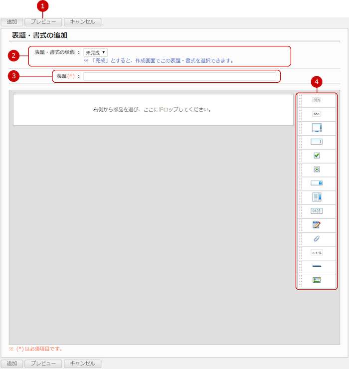表題・書式一覧画面の[表題・書式の追加]ボタンを押すと、表題・書式の追加画面が表示されます。