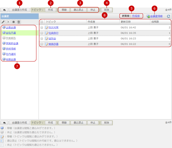 会議室管理のトピックの作成や稼働状況の変更については、一般ユーザーが使用する電子会議室機能と同じ操作で使用できます。