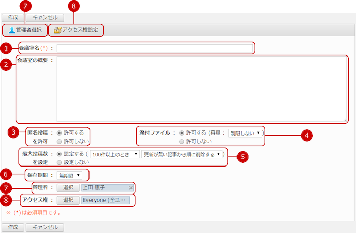 [会議室の作成]ボタンを押すと、会議室の作成画面が表示されます。