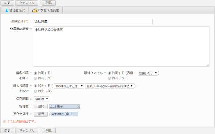 会議室の参照、トピックを作成できるユーザーを設定します。