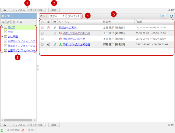 ・作成されたすべてのインフォメーションの閲覧、作成、変更、削除ができます。
