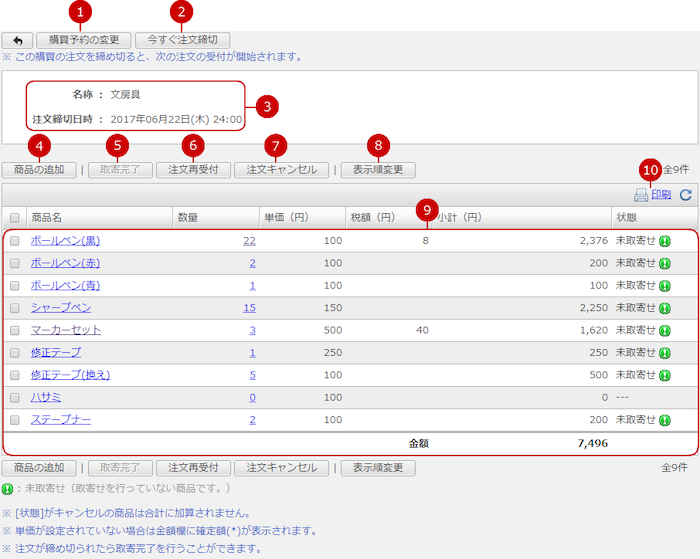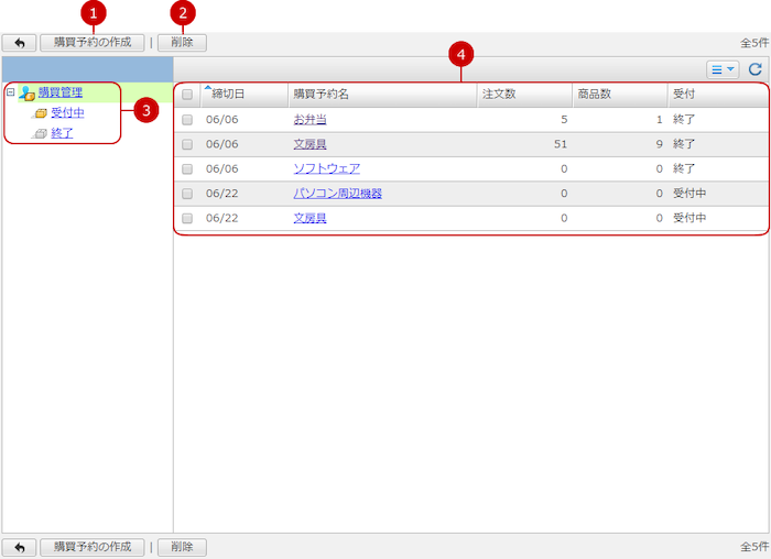 購買予約の機能管理では、 すべての購買予約、商品情報の管理ができます。