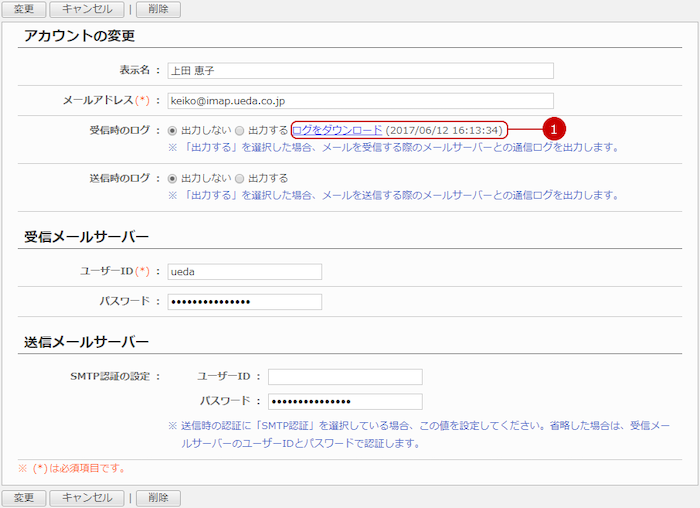 受信時のログ、送信時のログがある場合、ログをダウンロードするためのリンクが表示されます。