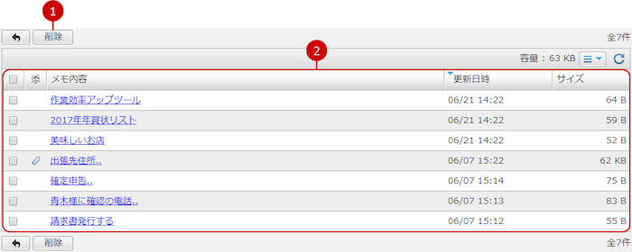 メモの一覧から削除したいものを選択し、このボタンで削除を実行します。複数のメモを同時に選択することもできます。