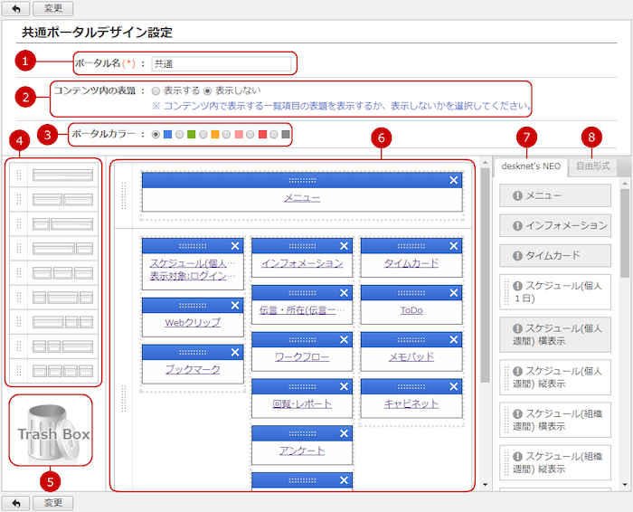 設定メニューの共通ポータルデザイン設定リンクを押すと、共通ポータルデザイン設定画面が表示されます。