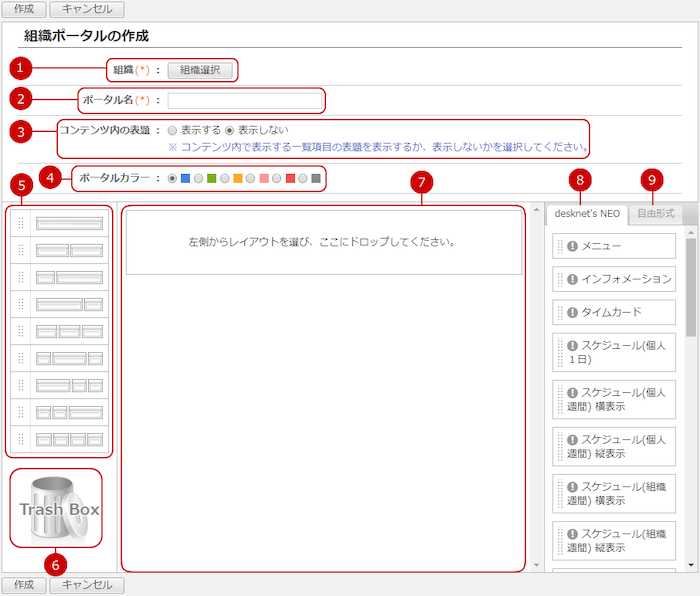 組織ポータルデザイン一覧画面の[ポータルの作成]ボタンを押すと、組織ポータルデザインの作成画面が表示されます。