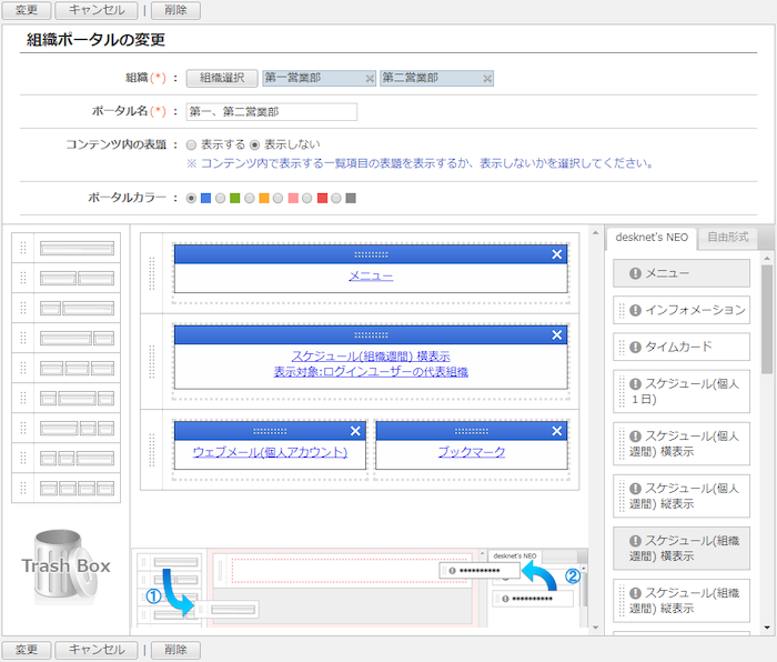 組織ポータルデザイン一覧画面のポータル名リンクを押すと、対象の組織ポータルデザインの変更画面が表示されます。