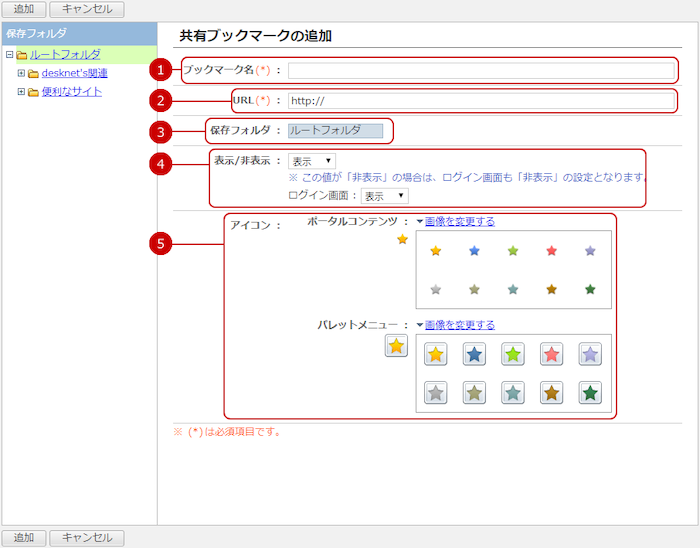 [ブックマークの追加]ボタンを押すと、共有ブックマークの追加画面が表示されます。