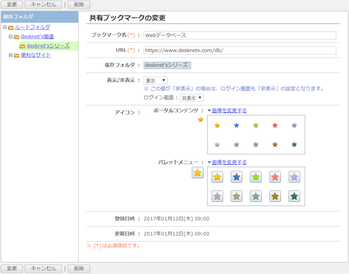 共有ブックマーク一覧のブックマーク名のリンクを押すと、共有ブックマークの変更画面が表示されます。