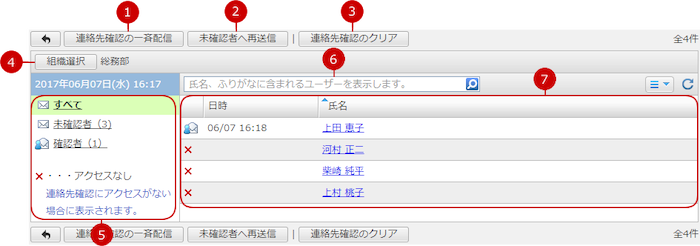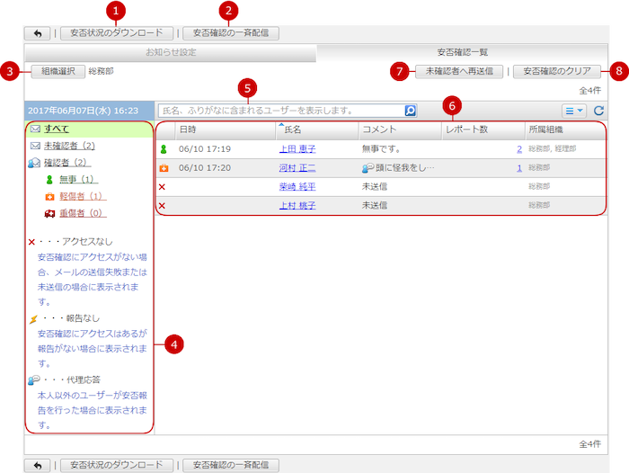 各ユーザーの安否状況の確認、ユーザーの緊急連絡先の確認と登録、安否が未確認のユーザーに対して確認メールの再送信ができます。