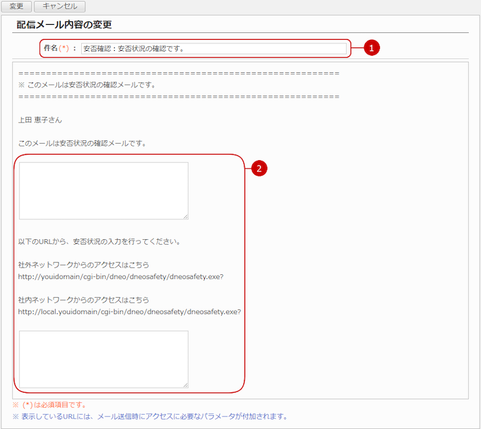 安否確認(防災訓練)メールの変更画面が表示されます。