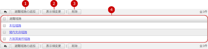設定メニューの防災設定>避難経路設定リンクを押すと、避難経路一覧画面が表示されます。