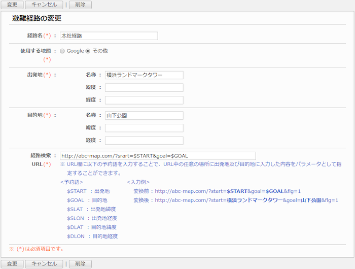 災害情報確認画面の会社指定の避難所の経路選択の選択肢、災害対策画面の帰宅経路検索の経路選択の選択肢を登録します。