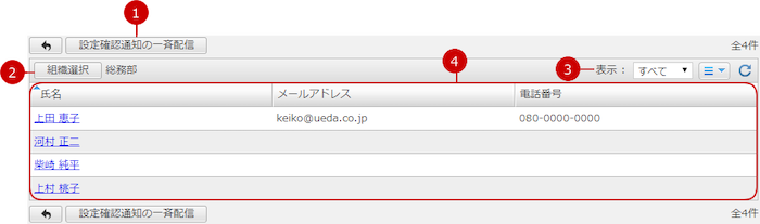 緊急連絡先の設定状況画面の[設定確認通知の一斉配信]ボタンを押すと、緊急連絡先設定確認の一斉配信画面が表示されます。