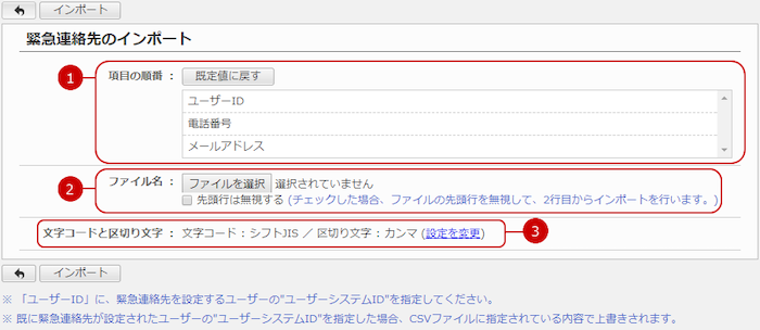 設定メニューの緊急連絡先設定>緊急連絡先のインポートリンクを押すと、緊急連絡先のインポート画面が表示されます。