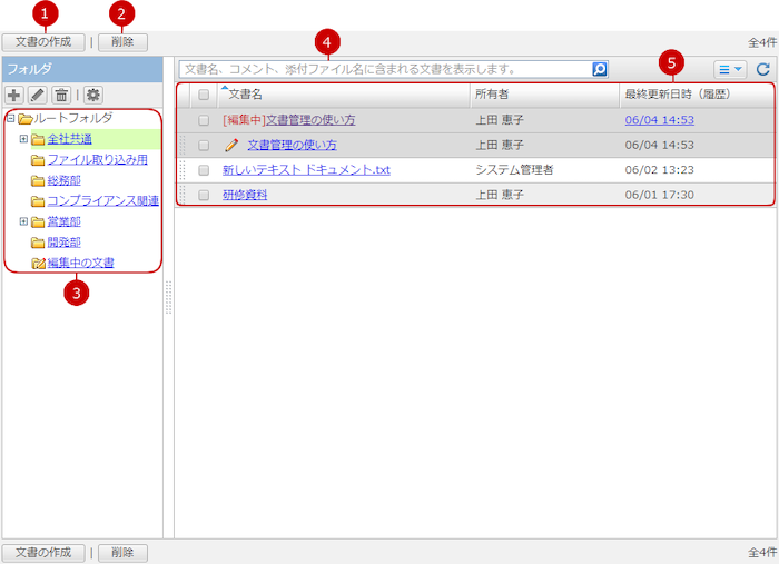 一覧のフォルダ一覧では、フォルダの作成、変更、削除、アクセス権の設定を行うことができます。
