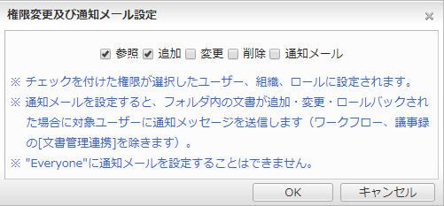 ※参照権限が設定されていない場合、追加・変更・削除権限、通知メールを設定することはできません。参照権限を解除すると自動的にアクセス権設定対象一覧から解除されます。