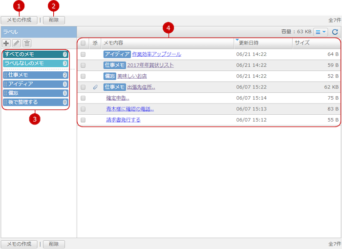 メモの新規作成、変更、ラベルによる分類、メモの削除ができます。