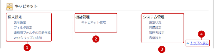 キャビネットの設定メニューリンク集