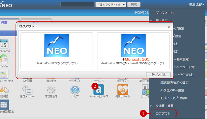 desknet's NEOとMicrosoft 365からログアウトします。プロフィールメニューの「ログアウト」リンクをクリックします。