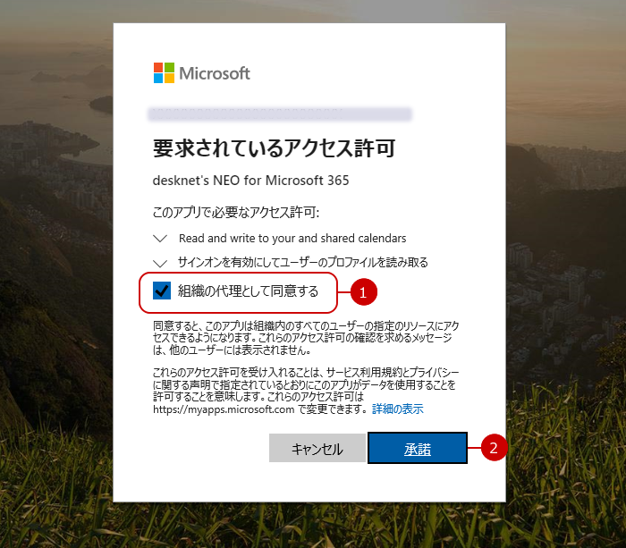 desknet's NEOのMicrosoft 365連携機能初回利用時には、「要求されているアクセス許可」の画面が表示されます。