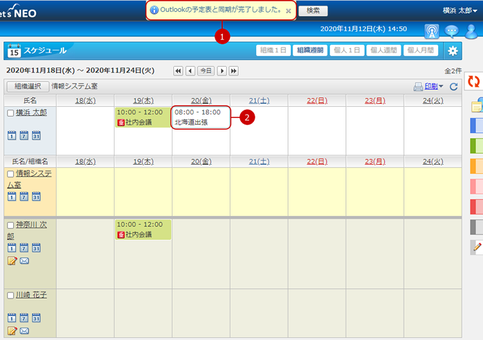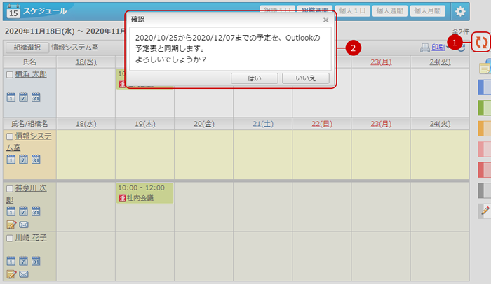 ボタンをクリックすることで、desknet's NEOのスケジュールデータとOutlookの「予定表」データを同期することができます。