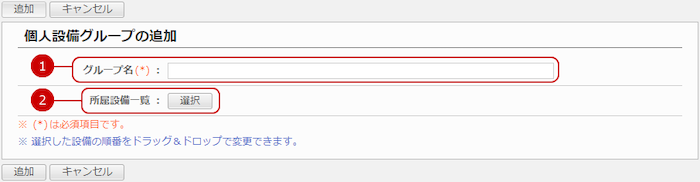 個人設備グループ一覧画面の[個人設備グループの追加]ボタンを押すと、個人設備グループの追加画面が表示されます。