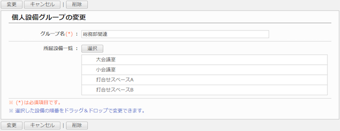 個人設備グループ一覧画面の個人設備グループ名のリンクを押すと、対象の個人設備グループの変更画面が表示されます。