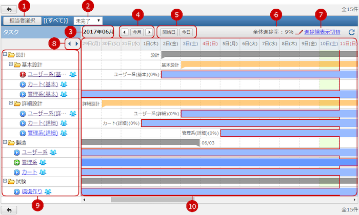 ガントチャート…対象プロジェクトのガントチャート表示に切り替えます。