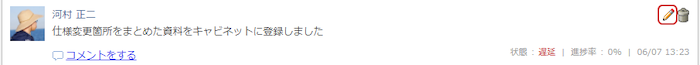 最新の進捗報告を自分が行なっている場合、進捗報告の右上にペンアイコンが表示されます。