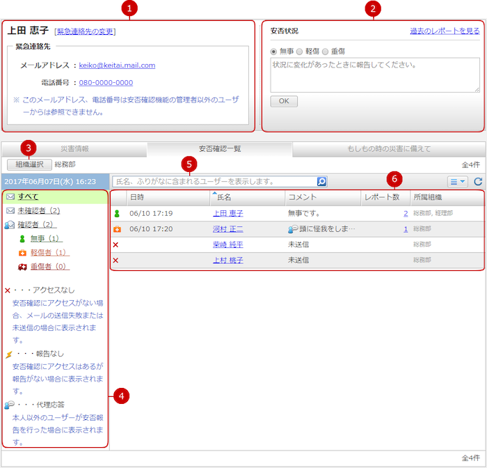未確認者、確認者、3つの安否状況(無事、軽傷者、重傷者)のリンクを押すと、それぞれの状況で安否確認一覧を絞り込みます。