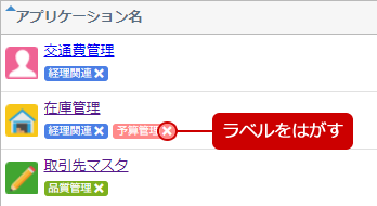 ラベル名の右にある×を押すと、アプリケーションに貼られているラベルをはがします。