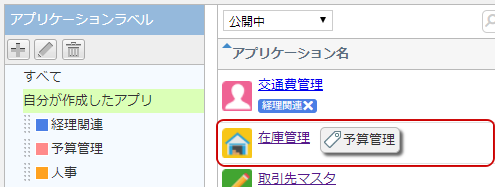 アプリケーションを分類するラベルの一覧と、ラベルによって分類されているアプリケーションの一覧が表示されます。