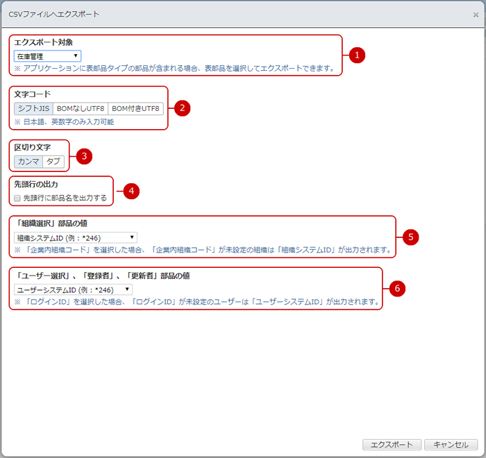ヘッダーメニューから「運用管理」の「CSVファイルへエクスポート」を押すと、CSVファイルへエクスポートダイアログが表示されます。