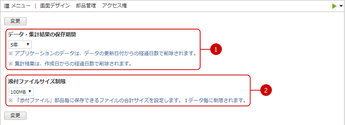 ヘッダーメニューから「アプリケーション」の「容量制限」を押すと、容量制限の設定画面が表示されます。